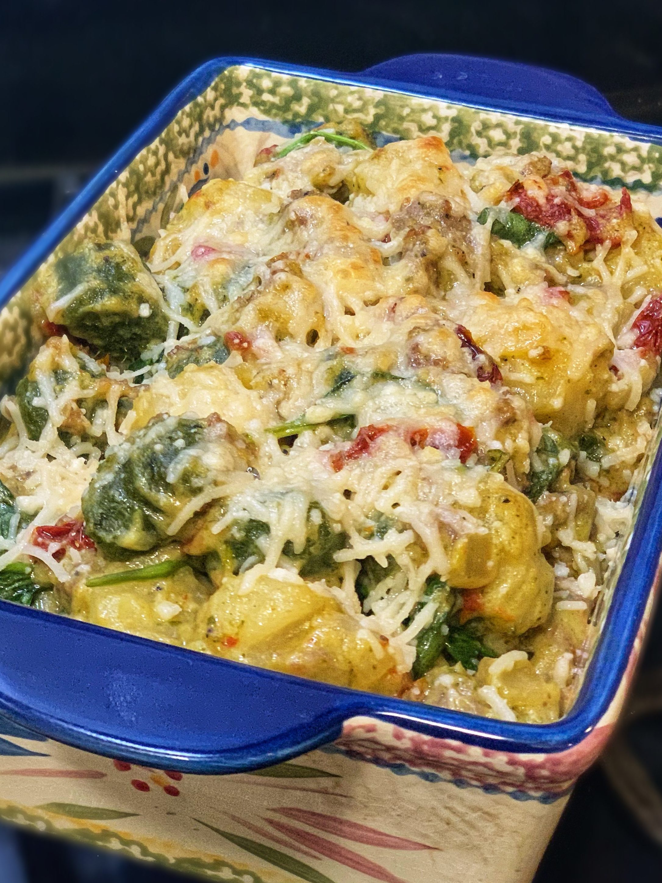Add in gnocchi, season with salt and pepper. Once cooked through (roughly 8 min), place entire mixture in your prepared baking dish. Sprinkle with more vegan parm, and place in oven to melt the cheese. Keep an eye on it as this will happen quick! I put mine on broil for 6 minutes.